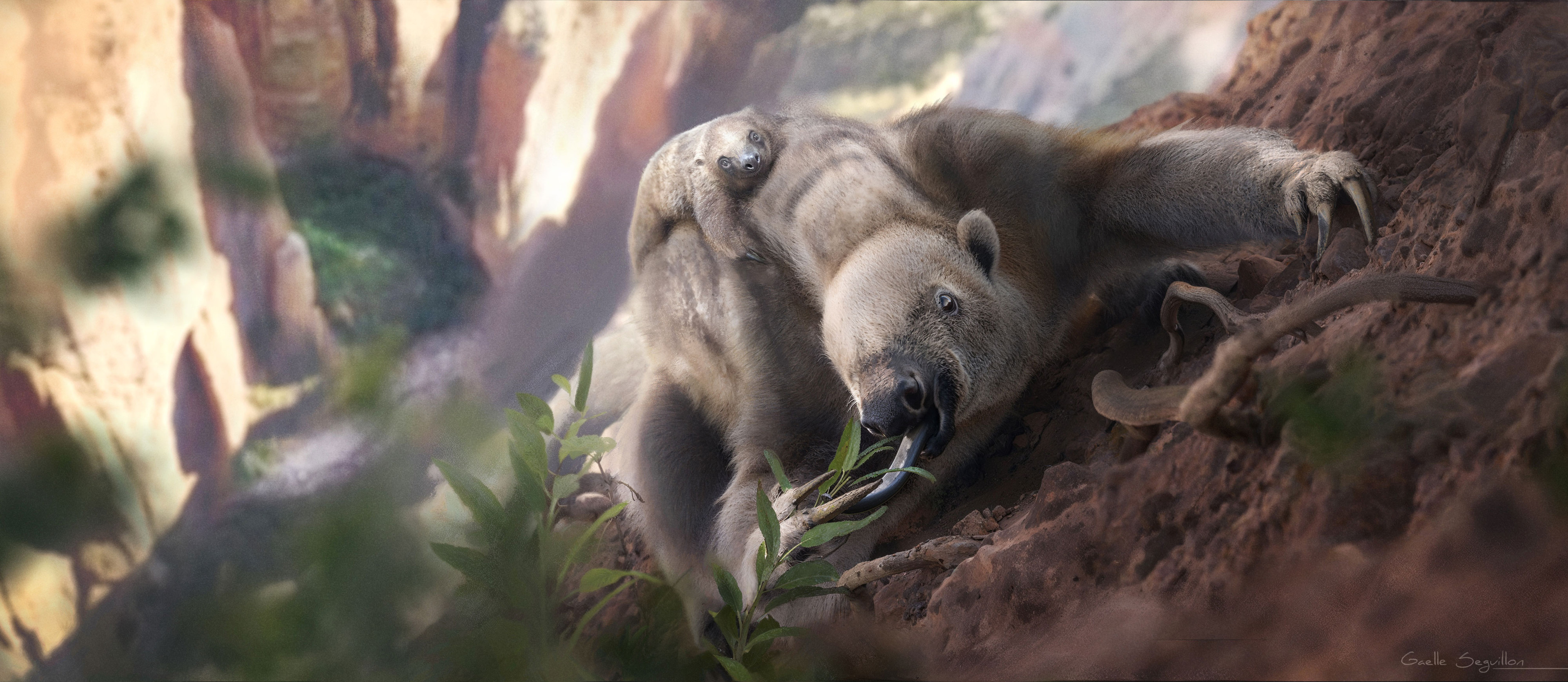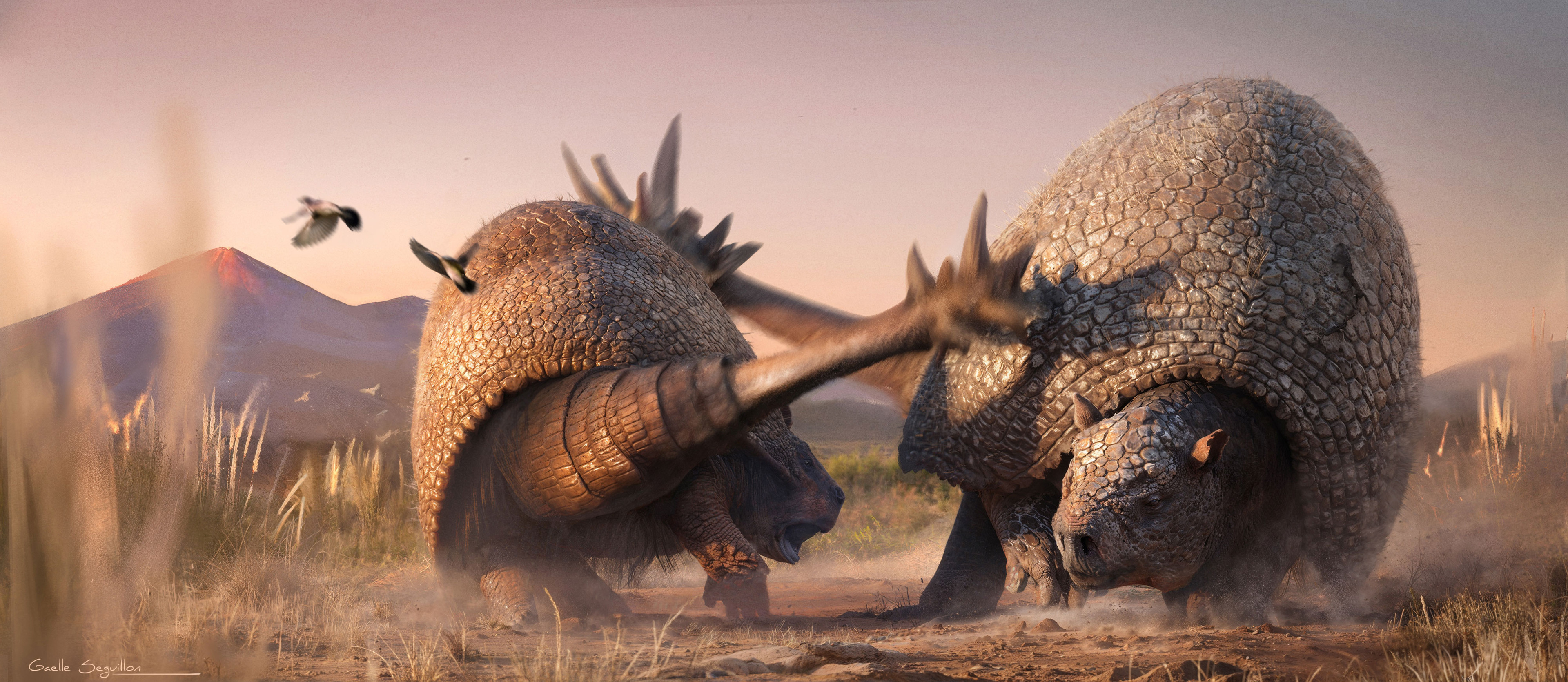 Here are two species from South America. Two Doedicurus are fighting for a female and a mother Diabolotherium climbs a steep cliff everyday to feed on top.